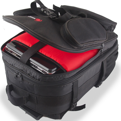 Compartimento Frontal para carregar cartões,pilhas, cabos e carregadores, espaço para note book.
